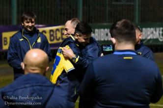 Вечерняя тренировка сине-желтых началась с приятного сюрприза. И. о. главного тренера Александр Петраков, традиционно собрав футболистов в круг, поздравил с днем рождения Николая Шапаренко. От имени команды коуч подарил имениннику футболку с автографами всех партнеров и номером 23...
