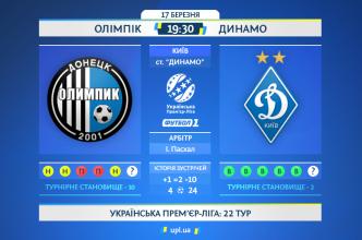 Матч 22-го туру «Олімпік» — «Динамо». Статистичне прев’ю.Арбітр: Ігор Пасхал (Херсон) провів 35 матчів в УПЛ.Історія зустрічейВсього зіграно 13 матчів: +1=2-10 м’ячі 4-24На полі Олімпіка — 6 матчів: +1=1-4 м’ячі 3-11В УПЛ зіграно 11 матчів: +1=1-9 м’ячі 3-20На полі Олімпіка — 5 матчів: +1=0-4 м’ячі 3-11Останній матч на полі Олімпіка17.09.2017...