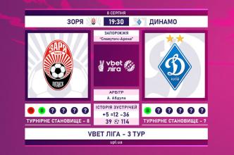 У третьому турі Прем'єр-ліги київське «Динамо» зіграє в Запоріжжі, де зустрінеться з «Зорею».Матч відбудеться в неділю, 8 серпня, на стадіоні «Славутич-Арена».Гра розпочнеться о 19:30.У прямому ефірі матч буде транслюватися на телеканалі «УНІАН»...