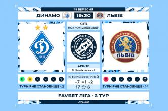 Матч 3 туру Favbet Ліги «Динамо» — «Львів». Статистичне прев’ю.Арбітр: Віктор Копієвський (Кропивницький) провів 36 матчів в УПЛ.Історія зустрічейВсього зіграно 10 матчів: +7=1-2 м’ячі 17-6 — всі в УПЛНа полі Динамо — 5 матчів: +3=1-1 м’ячі 7-2Останній матч на полі Динамо — 03.11.2019...