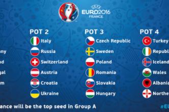 24 команды будет поделены на 6 групп по 4 команды в каждой. Финальная часть турнира стартует 10 июня 2016 года и финиширует на "Стад де Франс" 10 июля.Жеребьевка состоится в 19:00 по киевскому времени 12 декабря 2015 года в Париже.Процедура жеребьевки23 финалиста будут разделены на 4 корзины на основе коэффицентов сборных УЕФА...
