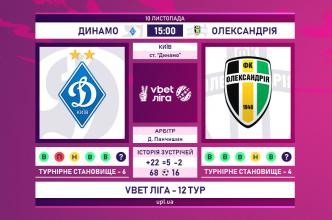 Матч 12-го туру «Динамо» – «Олександрія» відбудеться у четвер, 10 листопада, на стадіоні «Динамо» імені Валерія Лобановського, початок – о 15:00.